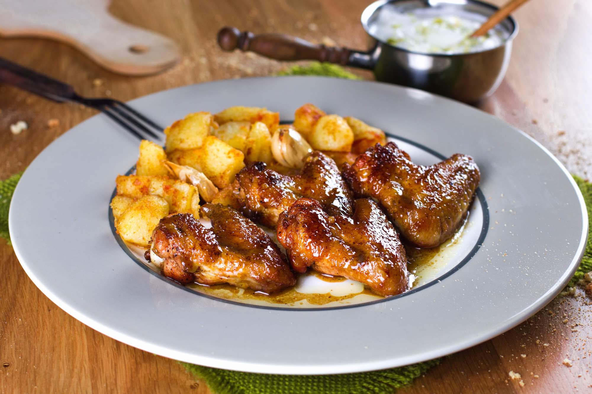 Odată rumenite, scoate-le cu grijă din tigaie și aruncă-le în sos. Tăvălește-le bine de tot. Scoate ulei din tigaie, cât să-ți mai rămână doar 1-2 linguri, apoi varsă aripioarele înapoi cu tot cu sos, iar focul dă-l nițel mai tare. Amestecă din când în când până sosul scade și se caramelizează (cam în 5 minute). Se mânâncă cu mâna și cu poftă bună!