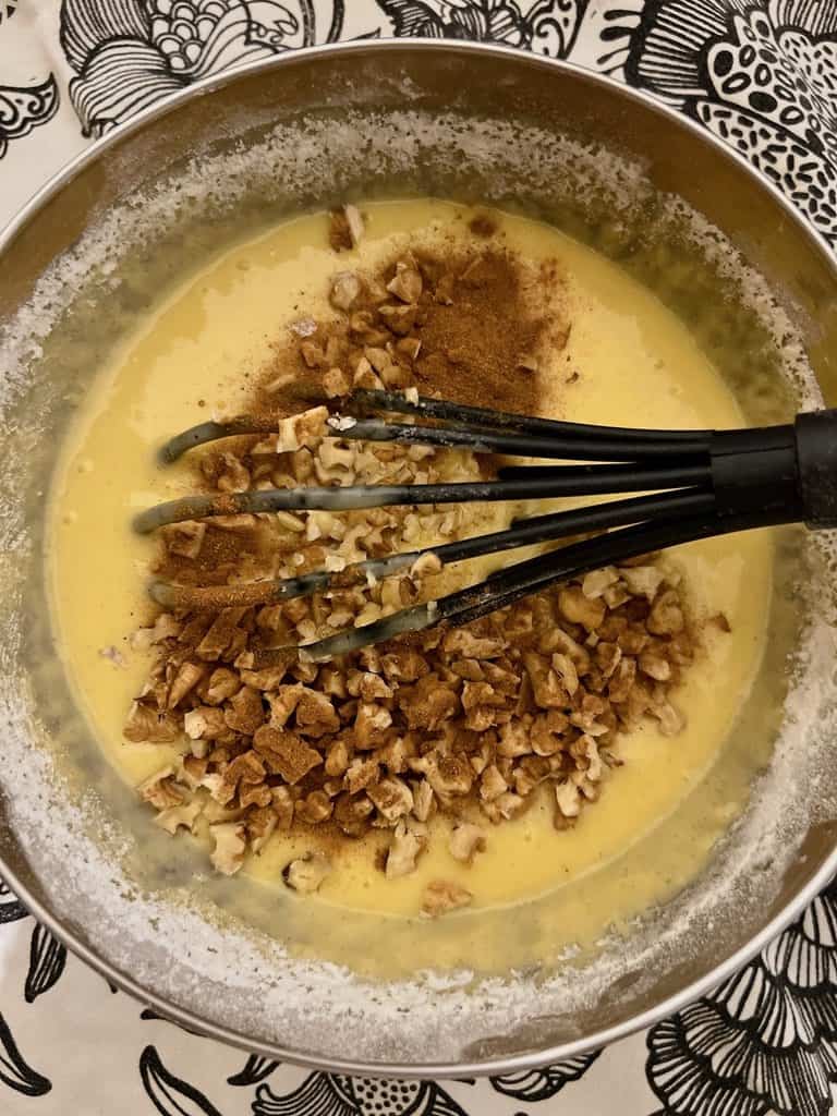 Peste cele lichide, toarnă în reprize uscatele, amestecând doar cât e necesar cu un tel sau lingură de lemn. După ce ai combinat totul frumos. Acum, varsă și nucile tocate. Amestecă doar cât să se disperseze nucile în aluat, dar fără să insiști cu amestecatul.