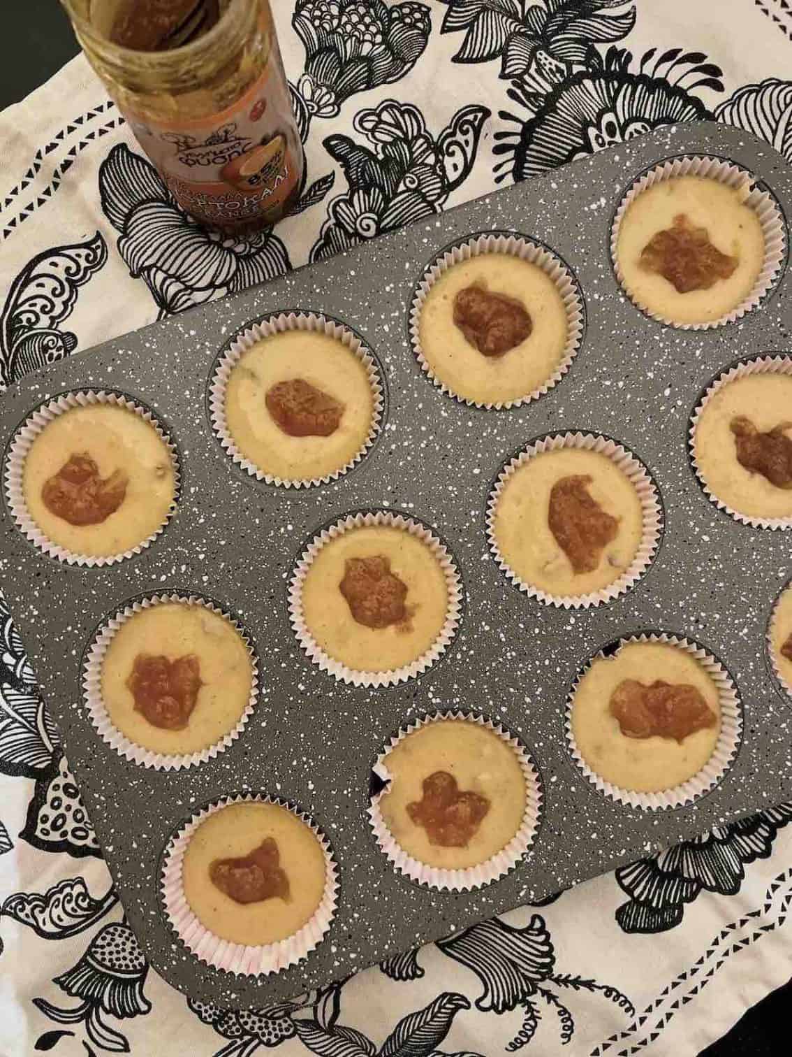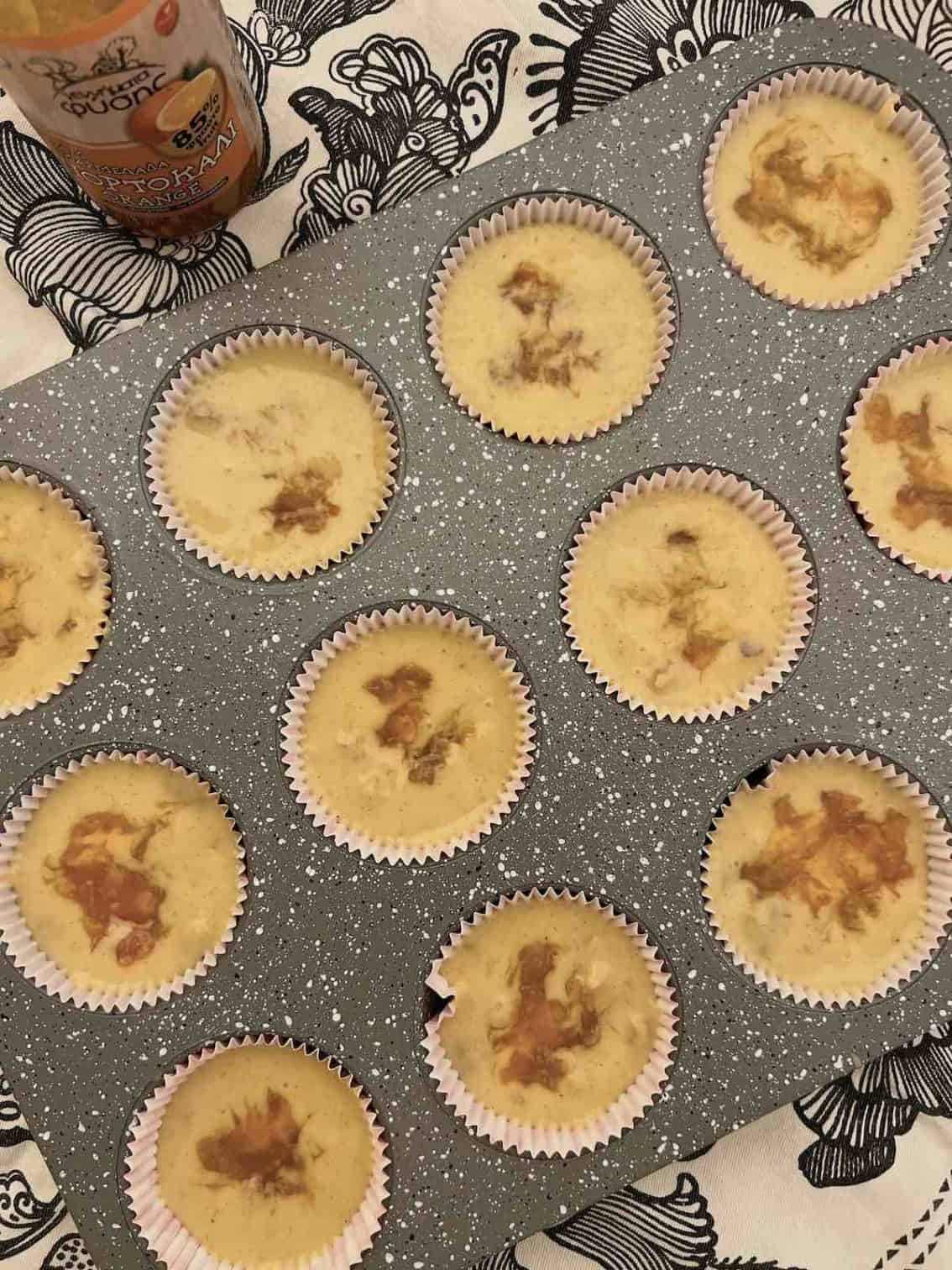Acum varsă aluatul în formele de brioșe. În fiecare pune și câte 1 linguriță plină de gem/dulceață de portocale. Apoi, amestecă puțin în fiecare și dă tava la cuptor pe rândul din mijloc.