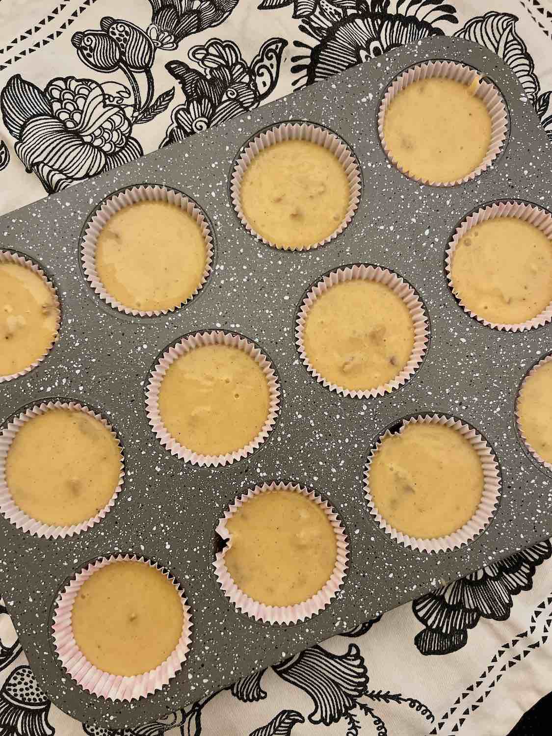 Prima dată, să încingem cuptorul.🔥 La 180°C/treapta 4/temperatură moderată e perfect. Și tot acum, poți pregăti și tava de brioșe. Eu am pus în tavă forme de hârtie (cups), dacă nu ai, unge fiecare adâncitură cu puțin ulei. Iar dacă ai forme de silicon, lor nu mai trebuie să le faci nimic. Doar ține-le aproape.