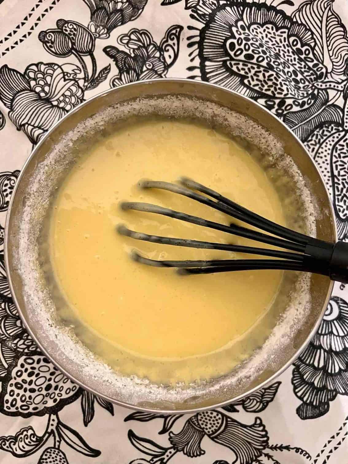 În celălalt bol pune-le pe cele umede: 2 ouă, 200 ml de lapte, 80 ml ulei și 1 linguriță de esență de vanilie/portocală.