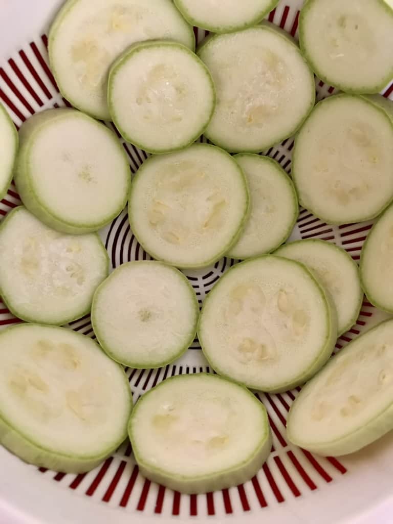 Spală dovlecelul, taie-i capetele, apoi fă-l rondele de aproximativ 0,7- 1 cm grosime. Așază rondelele pe o strecurătoare și presară pe ele sare. Cam 1 linguriță rasă la un dovlecel. Lasă-l deoparte pentru vreo 10 minute.