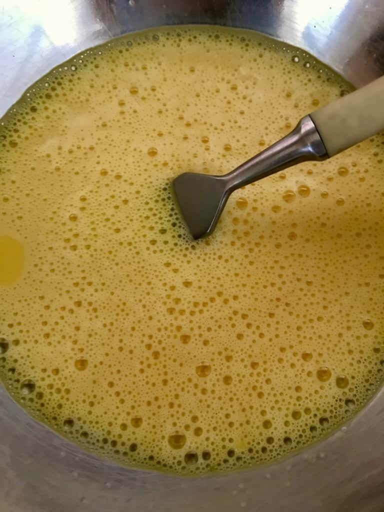 Sparge ouăle într-un castron și bate-le cu furculița, încorporând și laptele cu puțină sare și nițel piper. În alt castron, varsă făina.