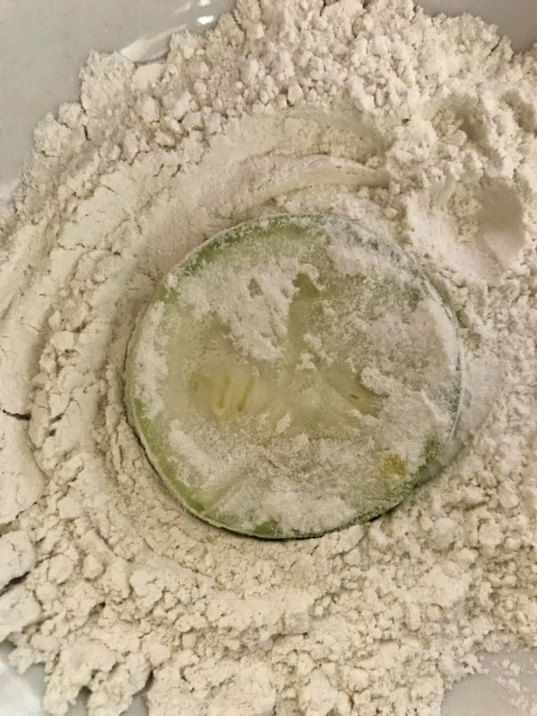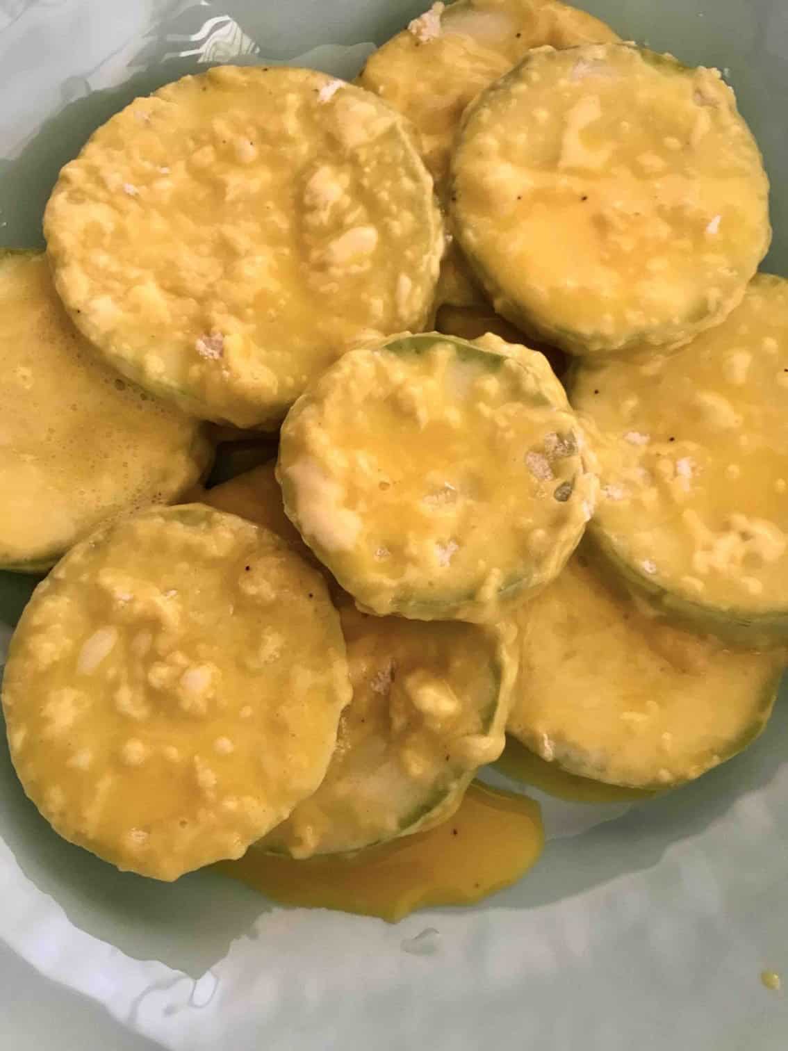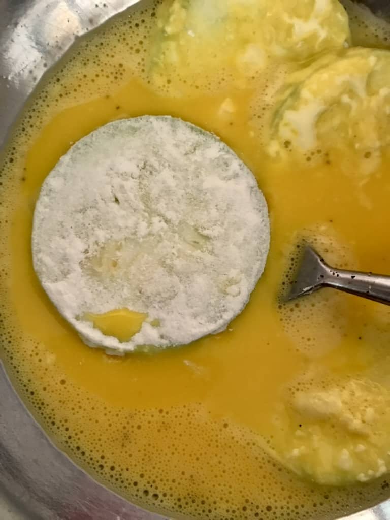 Dă fiecare rondea de dovlecel prin făină, scutur-o, scufund-o prin ouăle bătute și pune-o pe o farfurie mai mare.