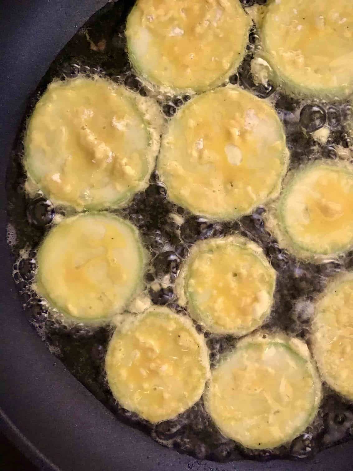 Când uleiul s-a încins bine (adică sfârâie când verși o picătură de apă), așază rondelele îmbrăcate în tigaie, într-un singur strat. După 1-2 minute, vezi dacă s-au rumenit și dacă da, întoarce-le pe verso și lasă-le tot cam atât.