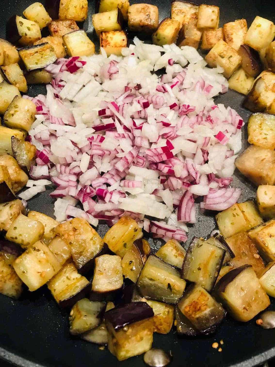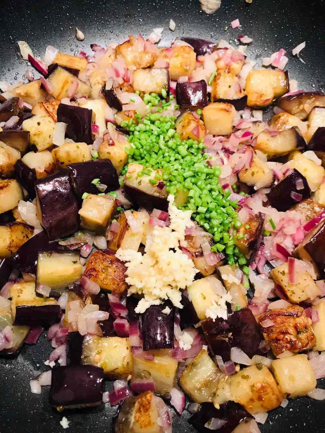 Dă focul la mai mic, împinge vinetele spre marginile tigăii și pune în mijloc ceapa. Amestecă din când în când în ceapă până vezi că devine translucidă (cam 2 minute), apoi împreunează vinetele de pe margine cu ceapa, adaugă cozile de pătrunjel și usturoiul. Amestecă timp de câteva secunde, după care pune oțetul balsamic. Amestecă până se evaporă oțetul, după care împinge iar legumele spre margine și în mijloc adaugă concentratul de roșii. Amestecă în el cu lingura timp de 1 minut, după care încă vreo 30 de secunde în toate împreunate.