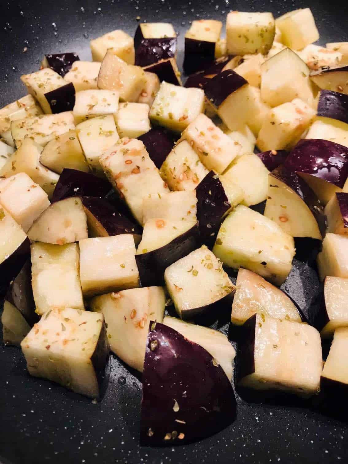 Ia o tigaie mare și așaz-o pe foc mediu. Varsă în ea 2 linguri de ulei de măsline și când uleiul s-a încins cât de cât, pune vinetele. Presară pe ele 1 linguriță de oregano uscat și amestecă din când în când până devin aurii (cam în 5 minute).