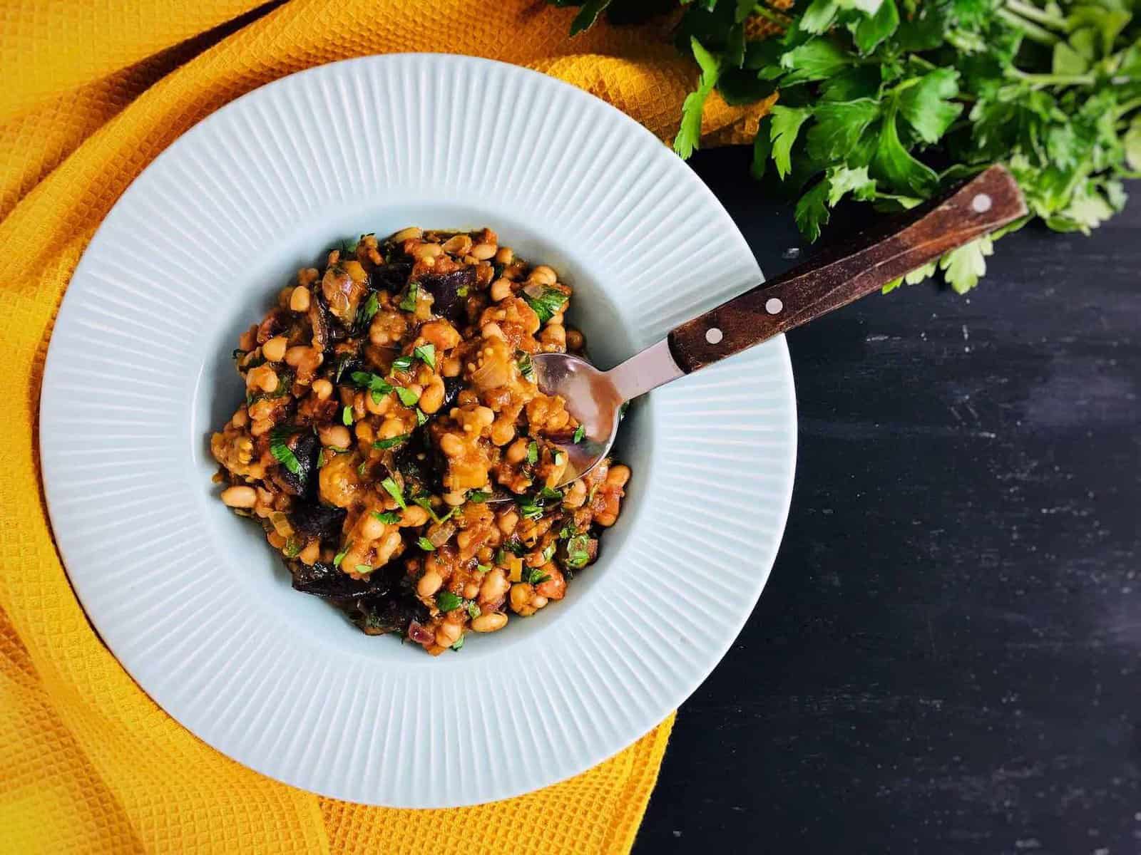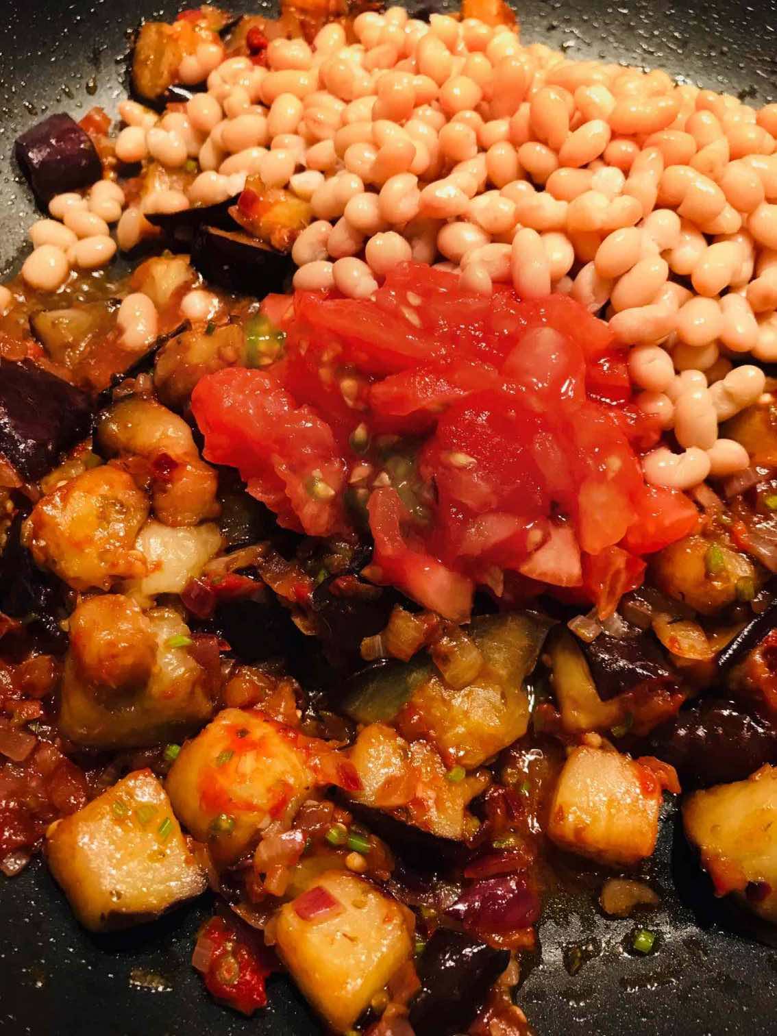 Gândindu-mă în ce fel să mai gătesc vinetele, m-am apucat să încropesc mâncarea asta care a ieșit absolut minunată. Vinete tinere, ceapă, usturoi, pătrunjel, fasole și roșii. La care am mai adăugat oțet balsamic și câteva condimente care se pupă bine cu vinetele. Dragoste în farfurie, dragoste în casă.