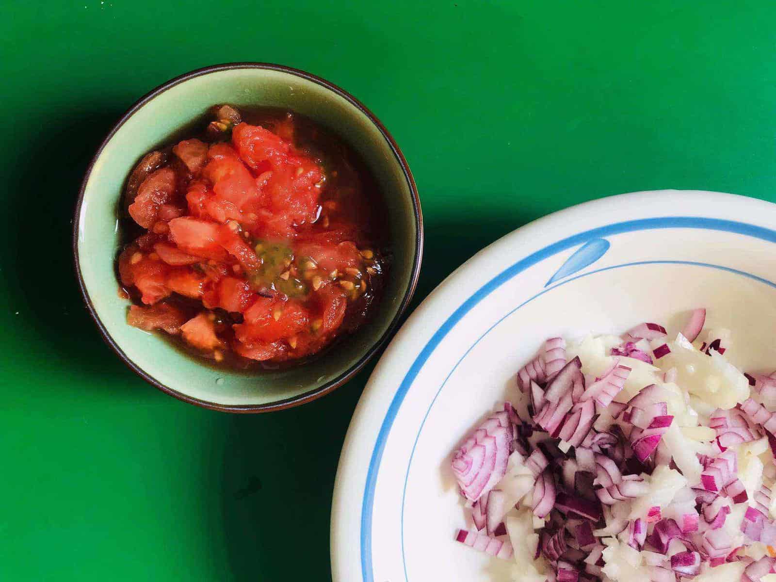 Când roșiile nu mai ard, decojește-le și taie-le cuburi mari/mici, așa cum apuci.