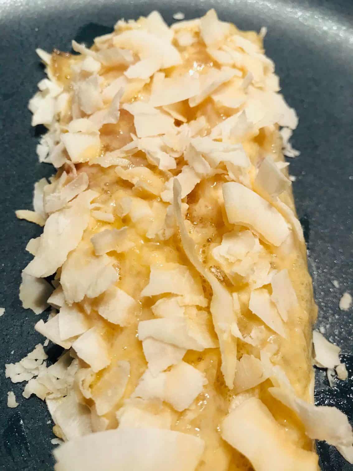 Dă prin făină un file de pește, tot așa față-verso, scutură-l să cadă de pe el excesul de făină, apoi dă-l prin oul bătut, scutură-l iar, după care dă-l prin cocos. Așază-l pe tavă și repetă operațiunea cu al doilea. Fulgii mai mari care ți-au rămas, pune-i deasupra fileurilor. Nu e nevoie să-i lipești, că numai bine, ăștia care stau mai în aer se vor și rumeni frumos. 😉 La final, stropește peștele ici-colo cu ulei.