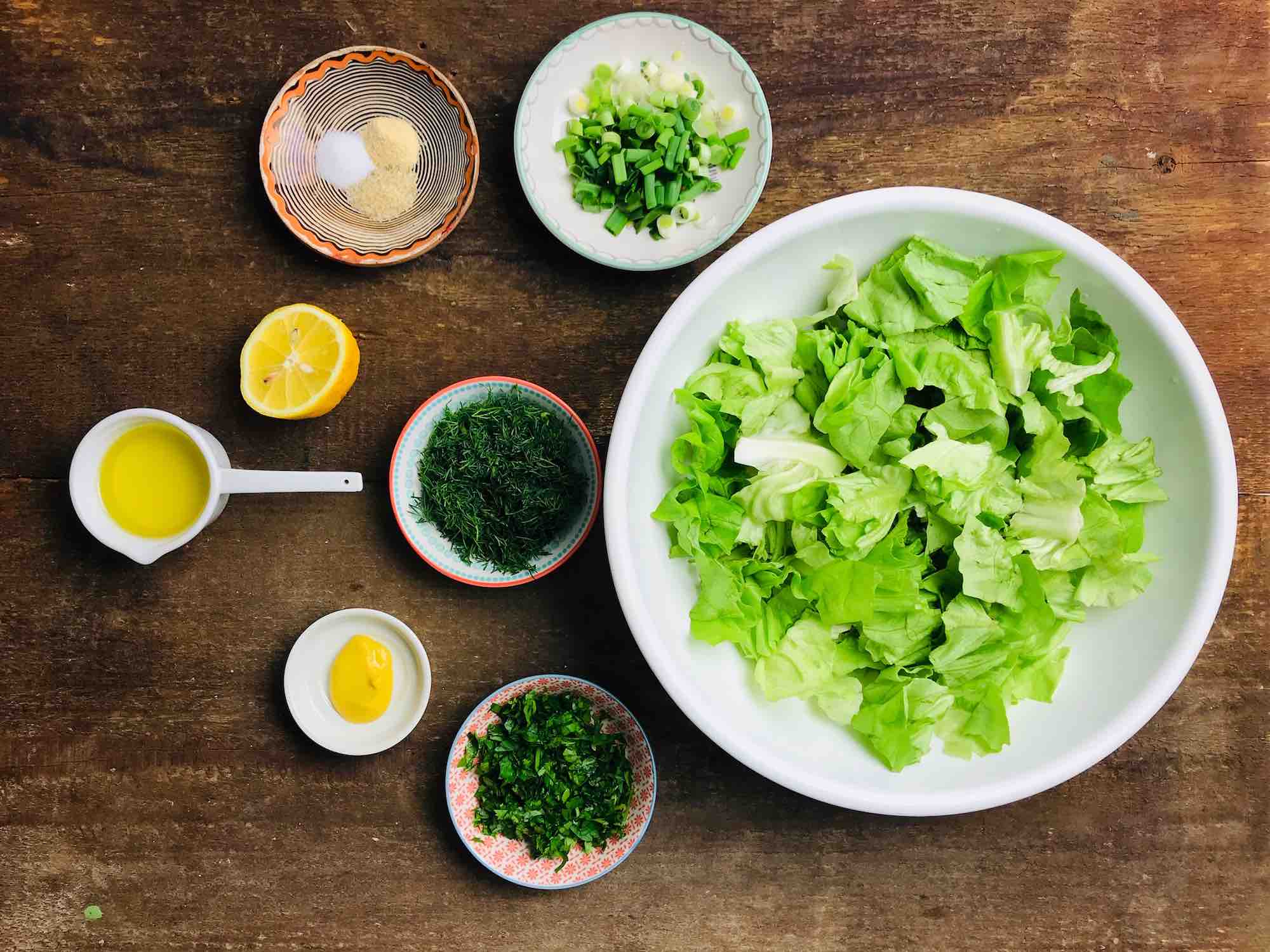Pe un tocător, taie ceapa verde rondele (bulb + frunze), toacă apoi frunzele de mărar și pătrunjel. Zvârlă-le și pe ele în bolul cel măreț. Amestecă-le, apoi sfințește-le cu vinegreta. Amestecă bine și timp de vreo 5 minute dă-i pace ca să apuce să se aromeze fiecare frunză verde.