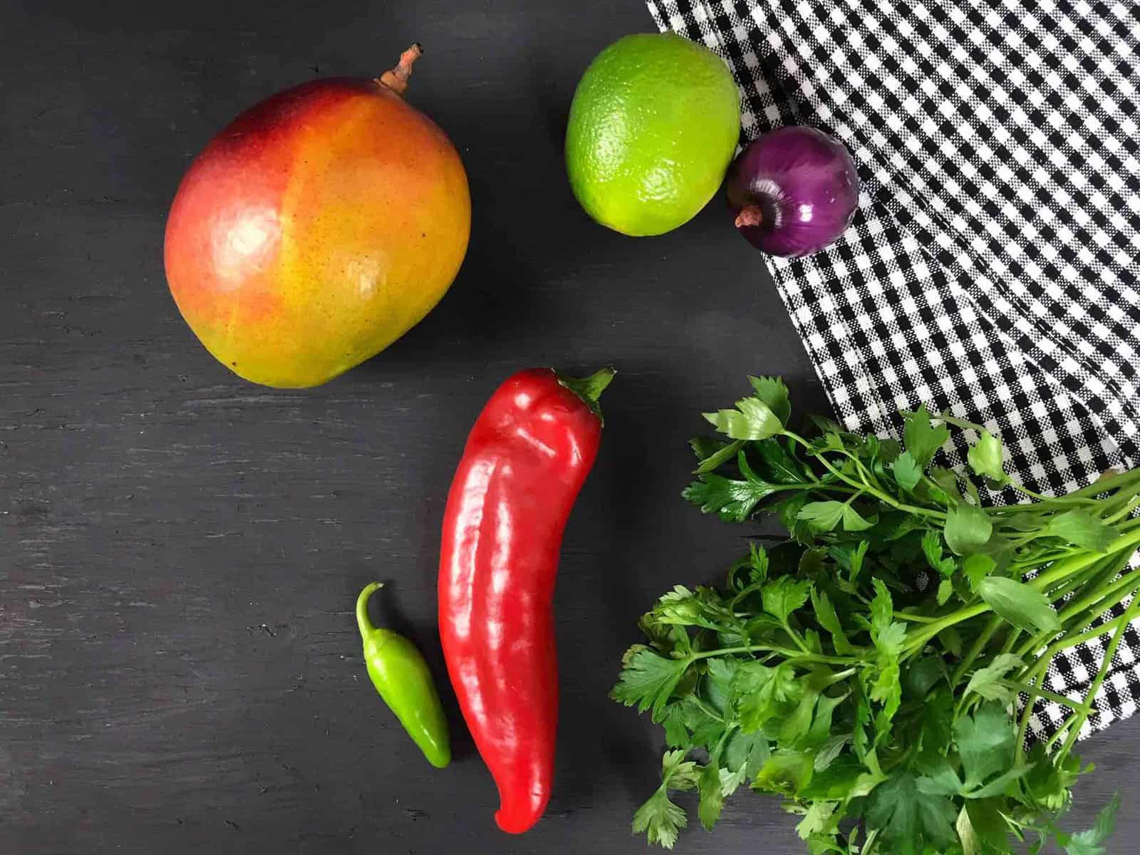 Prima dată curăță ceapa de coajă, ardeii de cotor și nervuri cu semințe cu tot. Spală-le bine împreună cu mango-ul, lime-ul și pătrunjelul cel verde. Șterge-le câta de apă.