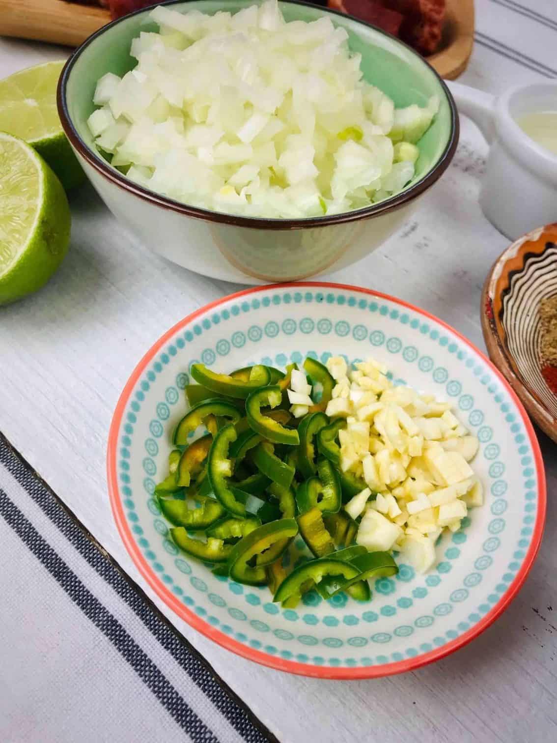 Taie ceapa cubulețe mici (0.3-0.4cm). Taie usturoiul tot cubulețe mici. Ardeiul iute taie-l în ½ pe lung, îndepărtează-i cotorul și în funcție de cât de picantă dorești mâncarea, scoate-i parțial sau de tot nervurile cu semințele. Apoi taie fiecare jumătate în felii subțiri.
