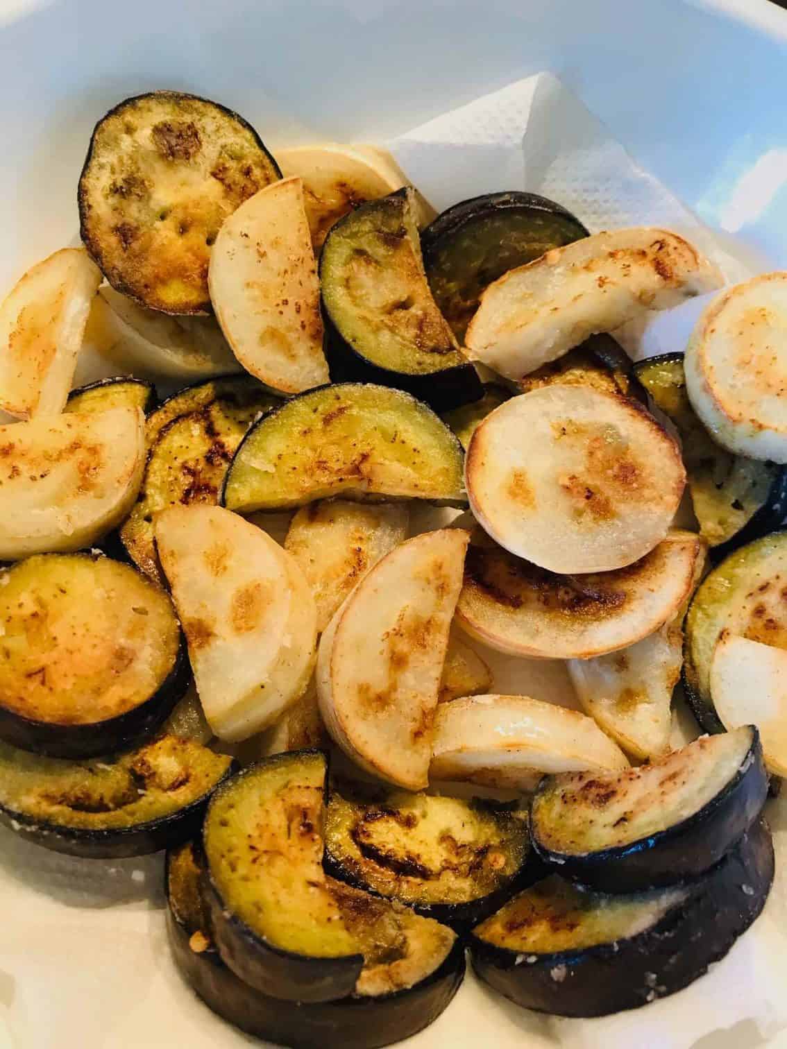 Varsă 2 linguri de ulei într-o tigaie mare și așaz-o pe foc mediu spre mare. Când uleiul s-a încins, așază frumos vinetele, să nu stea una peste alta. Întoarce-le abia când vezi că s-au rumenit ușor. În aproximativ 8-10 minute, dacă sunt rumene pe ambele părți și moi (dar ferme, nu papleașcă, că vrem să le simțim textura când mușcăm din ele), scoate-le pe o farfurie pe care ai așternut un șervet de hârtie.