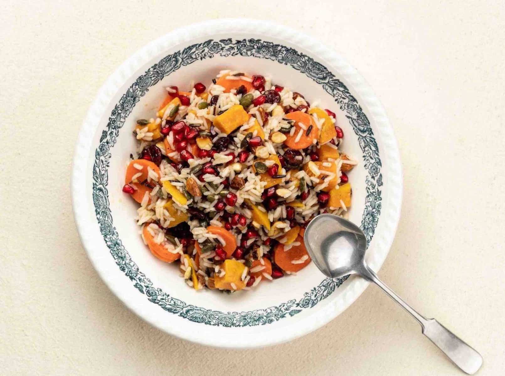 O salată sănătoasă și sățioasă, care poate ține lejer loc de prânz sau cină. Cu orez, cartofi dulci, morcov, semințe de rodie și merișoare deshidratate. Și cu miez de dovleac și migdale. Toate astea învăluite într-o dressing bun tare, cu suc de portocală și mirodenii calde. Rețeta e simplă că…
