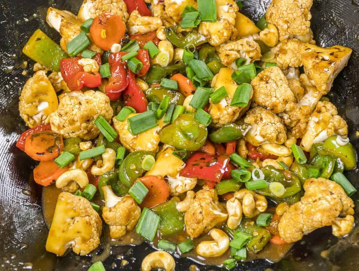 O rețetă vegană, rapidă și gustoasă, în stil asiatic. Cu buchete de conopidă, ardei grași colorați, morcov, ceapă verde și caju crocant. Toate trase la tigaie pe foc iute și învăluite apoi într-un sos plin de umami. Pentru garnitură, cel mai bine mi se pare că merge un orez fiert…